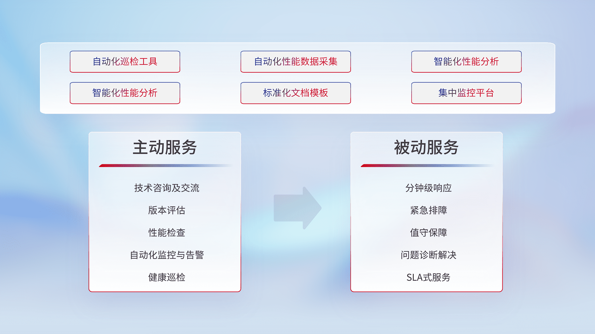 智能化工具和标准化文档,,保障服务质量,,,,提供主动服务(包含技术咨询、、、版本评估、、、、性能检查、、、、自动化监控与告警、、、、健康巡检)和被动服务包含(分钟级响应、、、、紧急排障、、、值守保障、、、、问题诊断解决、、、SLA服务)。。。。